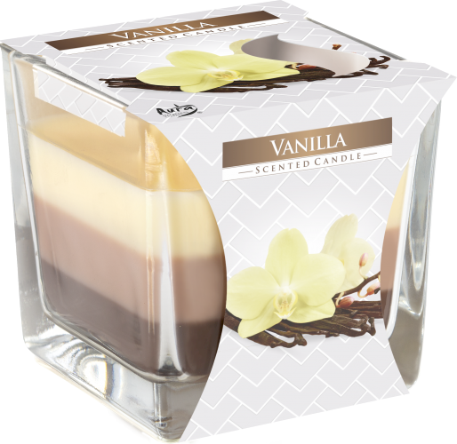 Candela alla vaniglia con fragranza calda e avvolgente. Estetica colorata, doppio stoppino, perfetta per ambienti rilassanti.